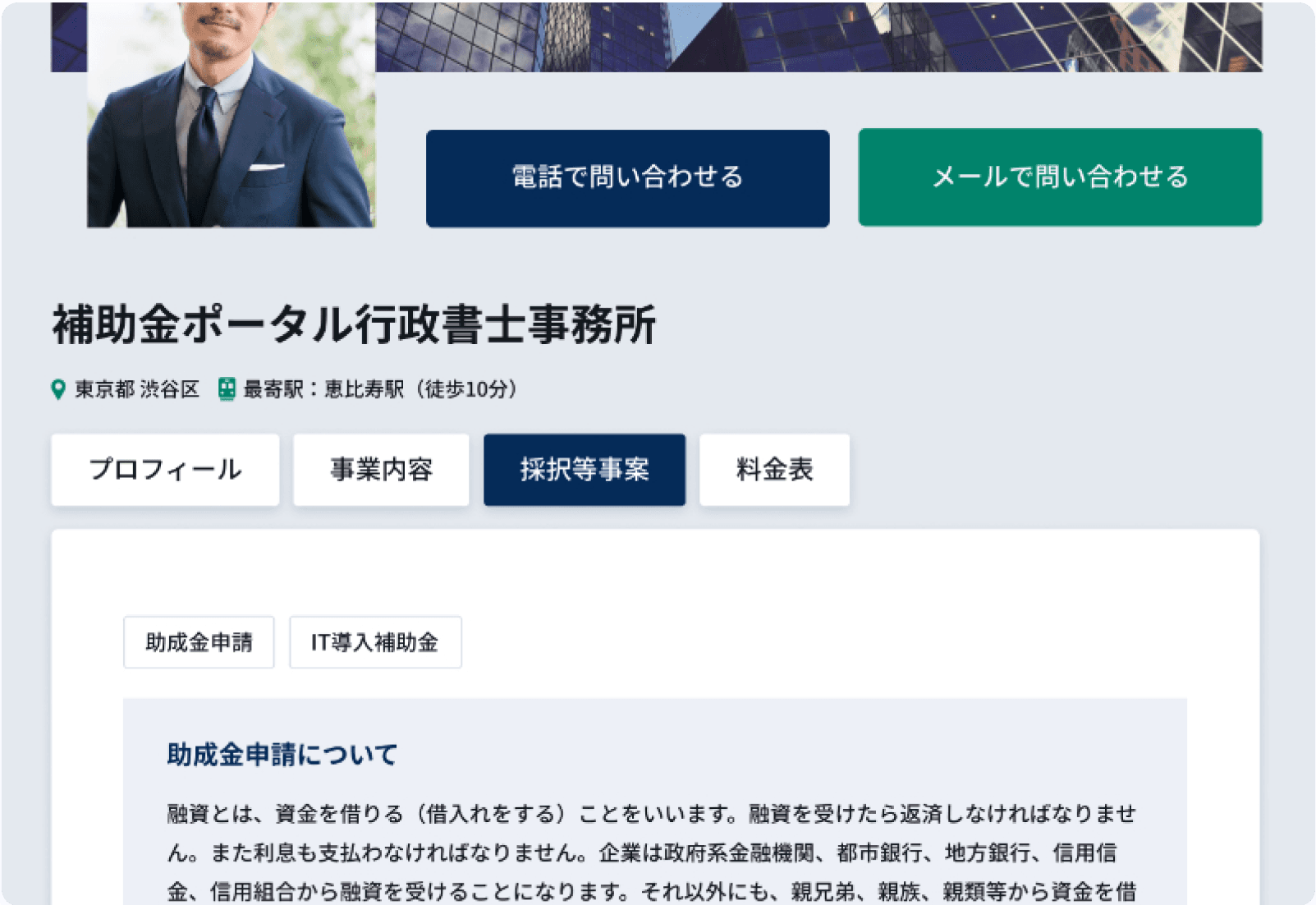 事務所のプロフィール、事業内容、採択等事案、料金表の掲載が可能です。