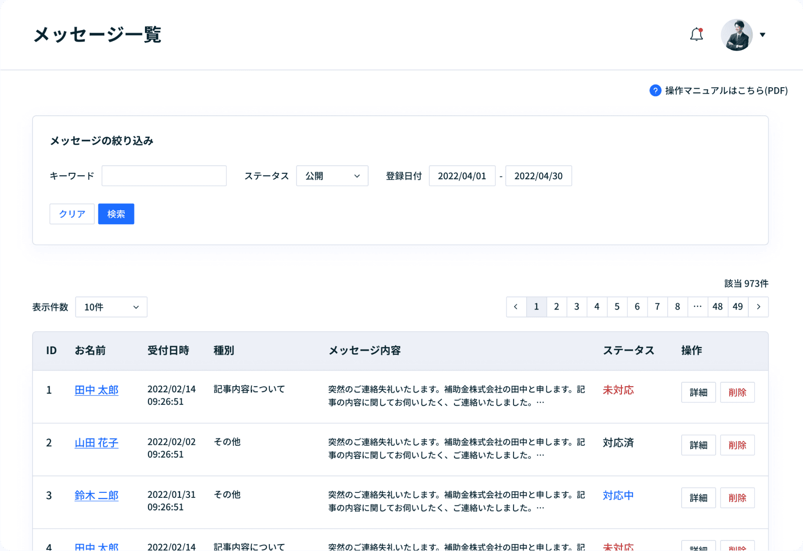 顧客ごとの進捗ステータスを一覧でご確認いただけたりと、